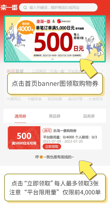 活动时间开始后,前4,000笔“乐淘一番”订单,单笔订单商品金额满5,000日元(不含运费、不含支付手续费)即可使用500日元购物券1张!!先下单先得!!!(购物券每人限领3张)