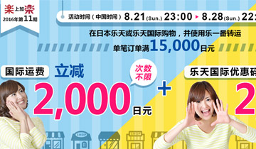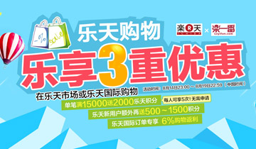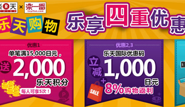 8月14日23:00 〜 8月19日22:59 乐天购物单笔满15000送2000积分,一个用户5次 (9月30日)