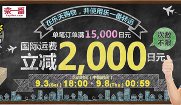 9月3日18:00 〜 9月8日00:59 乐天购物单笔满15000减2000,次数不限
