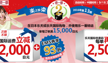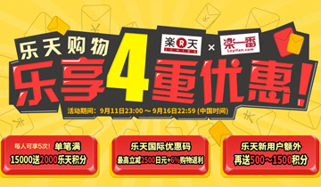9月11日23:00 〜 9月16日22:59 乐天购物单笔满15000送2000积分,一个用户5次 (10月31日)