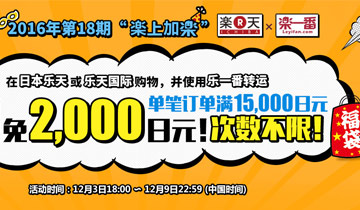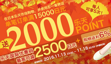 11月13日23:00 〜 11月18日22:59 乐天购物单笔满15000送2000积分,一个用户5次 (12月31日)