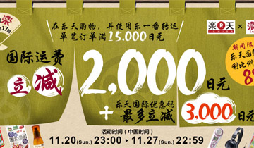 11月20日23:00 〜 11月27日22:59 乐天购物单笔满15000减2000,次数不限