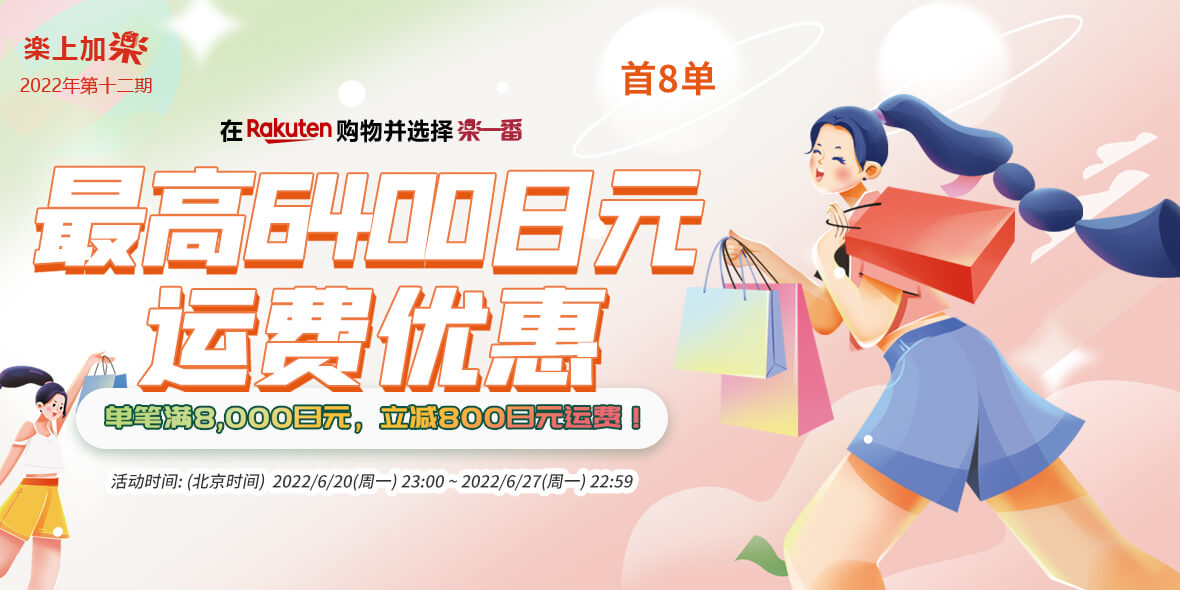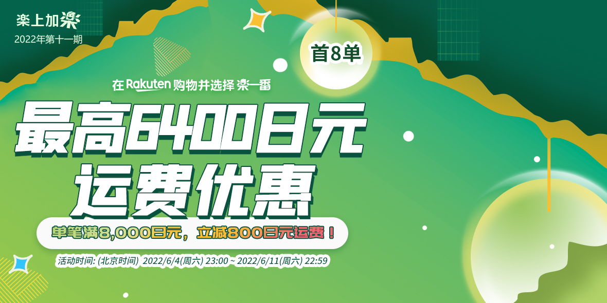 2022年6月20日(周一)23:00 ~ 2022年6月27日(周一)22:59 乐天购物单笔订单满8000减800。