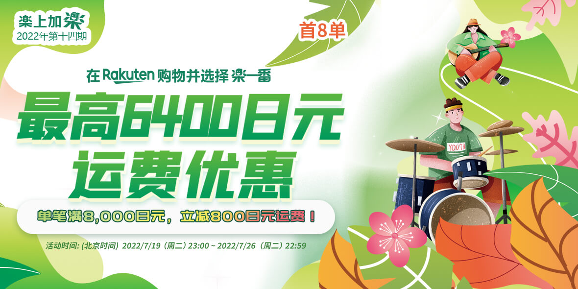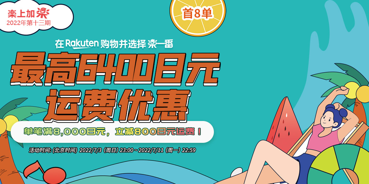 2022年7月3日(周日)23:00 ~ 2022年7月11日(周一)22:59 乐天购物单笔订单满8000减800。