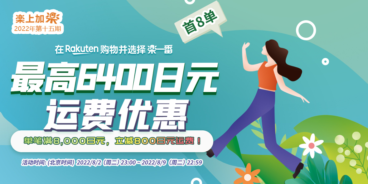 2022年8月2日(周二)23:00 ~ 2022年8月9日(周二)22:59 乐天购物单笔订单满8000减800。