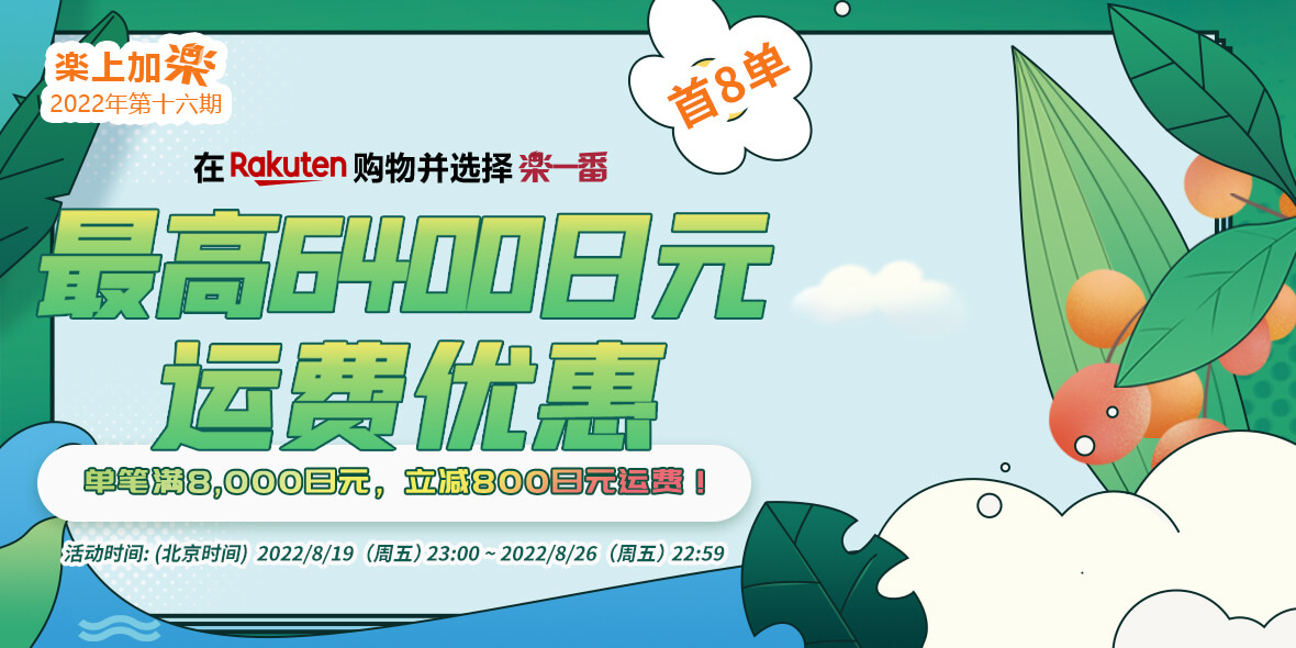 2022年8月19日(周五)23:00 ~ 2022年8月26日(周二)22:59 乐天购物单笔订单满8000减800。