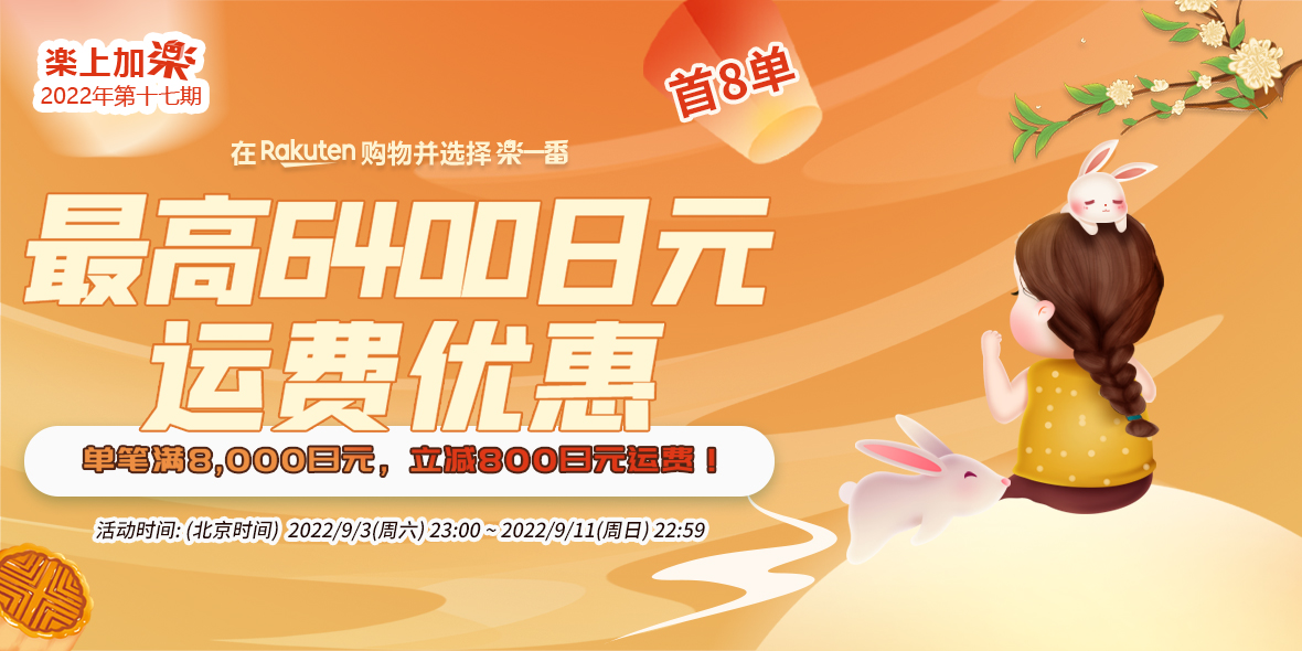 2022年9月3日(周六)23:00 ~ 2022年9月11日(周日)22:59(北京时间) 乐天购物单笔订单满8000减800。