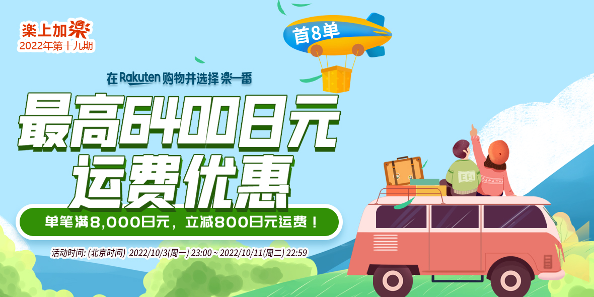 2022年10月3日(周一)23:00 ~ 2022年10月11日(周二)22:59 乐天购物单笔订单满8000减800。
