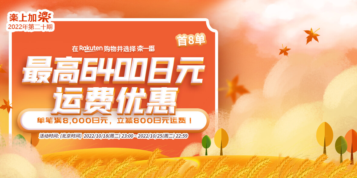 2022年10月18日(周二)23:00 ~ 2022年10月25日(周二)22:59 乐天购物单笔订单满8000减800。