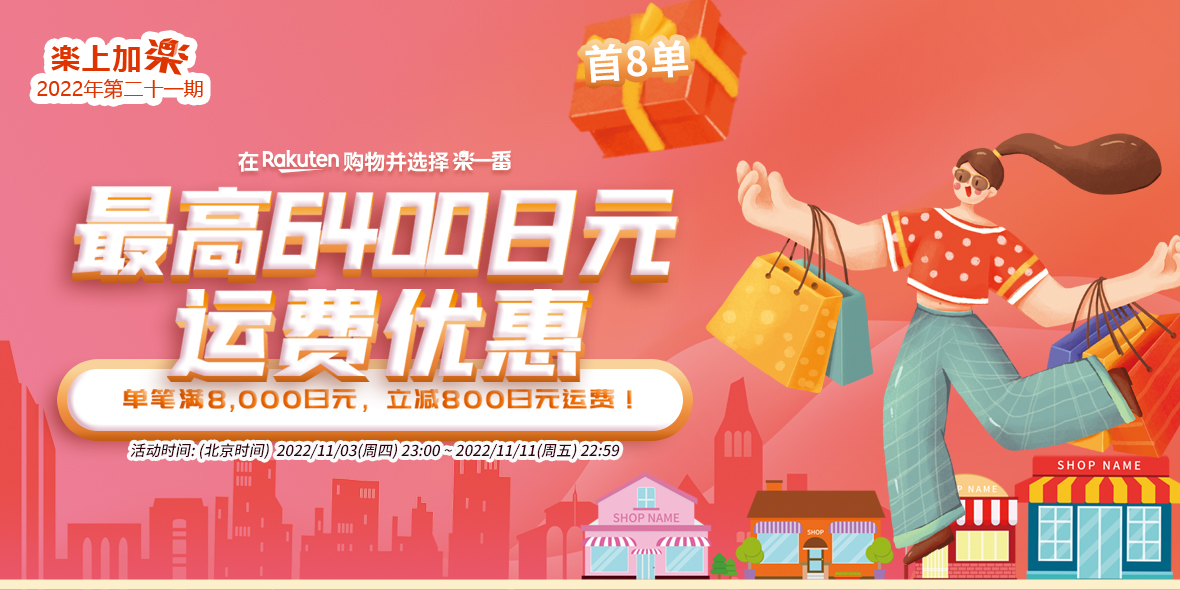 2022年11月03日(周四)23:00 ~ 2022年11月11日(周五)22:59 乐天购物单笔订单满8000减800。