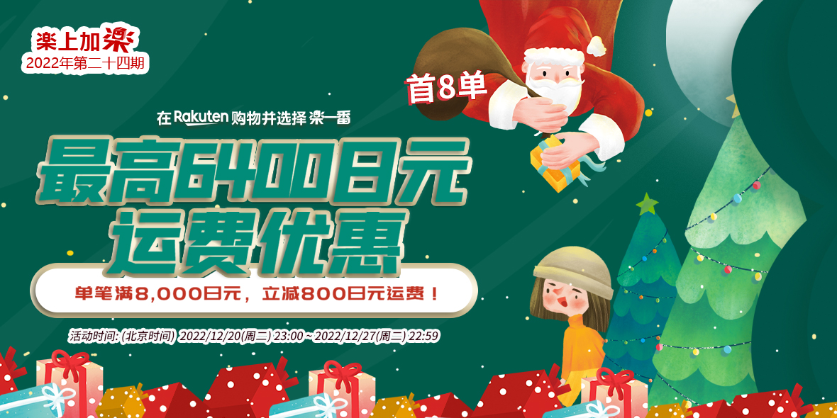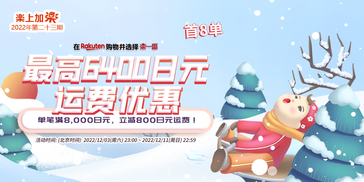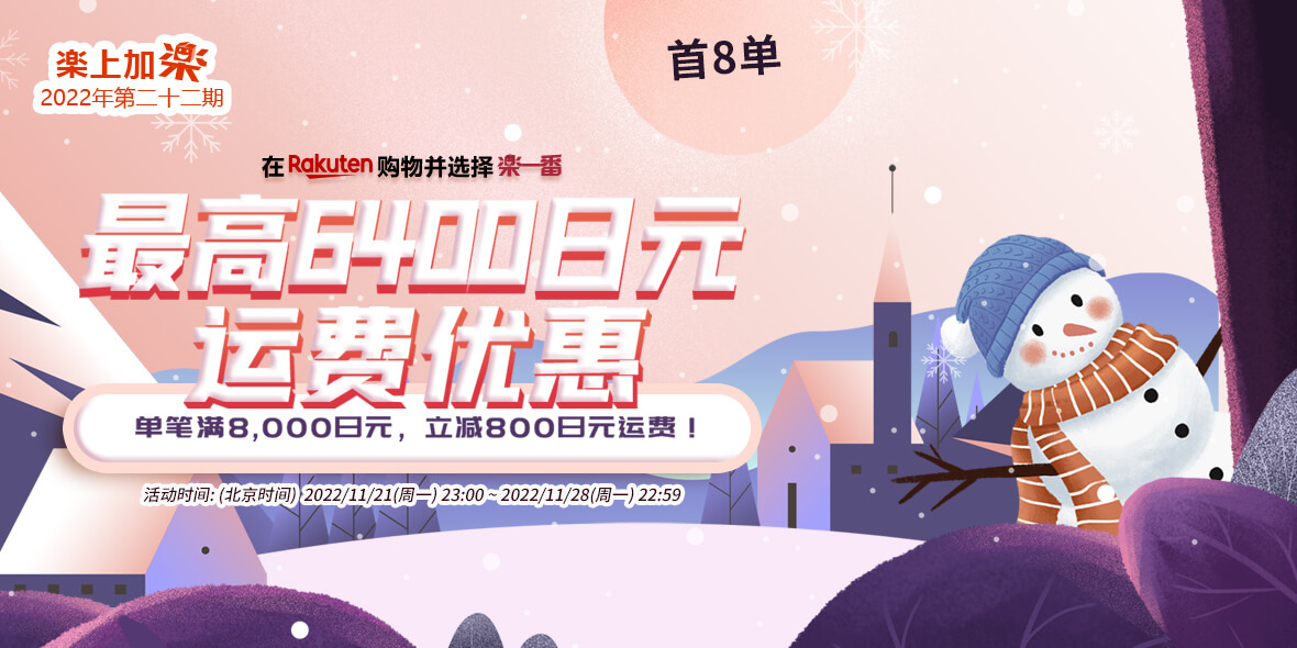 2022年12月20日(周二)23:00 ~ 2022年12月27日(周二)22:59 乐天购物单笔订单满8000减800。