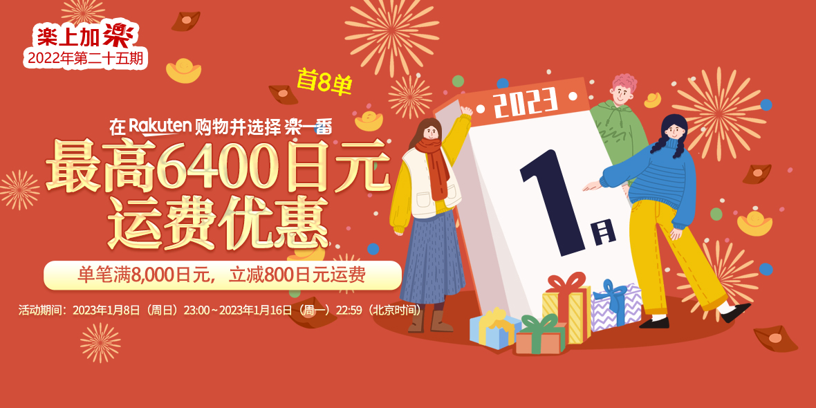 2023年1月8日(周日)23:00 ~ 2023年1月16日(周一)22:59 乐天购物单笔订单满8000减800。