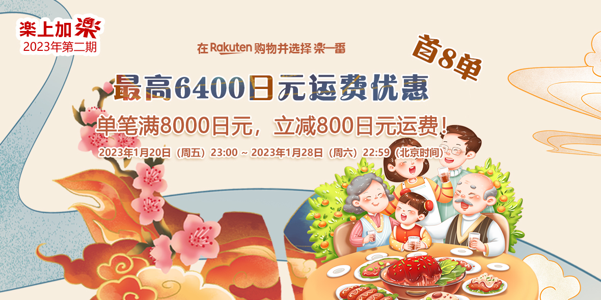 2023年1月20日(周五)23:00 ~ 2023年1月28日(周六)22:59 乐天购物单笔订单满8000减800。