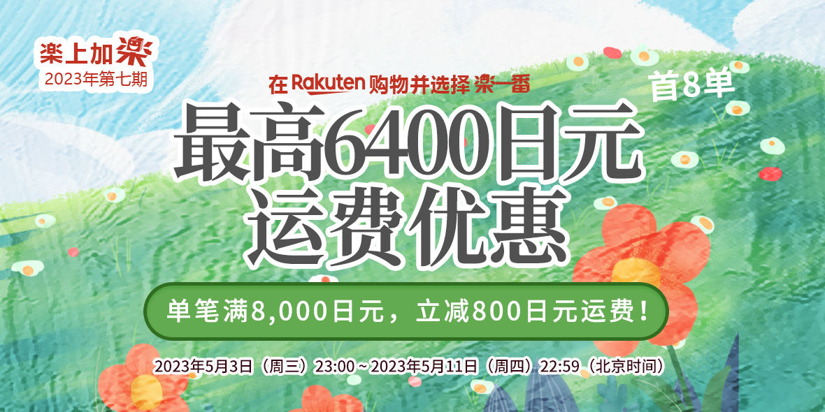 2023年5月3日(周三)23:00 ~ 2023年5月11日(周四)22:59 乐天购物单笔订单满8000减800。