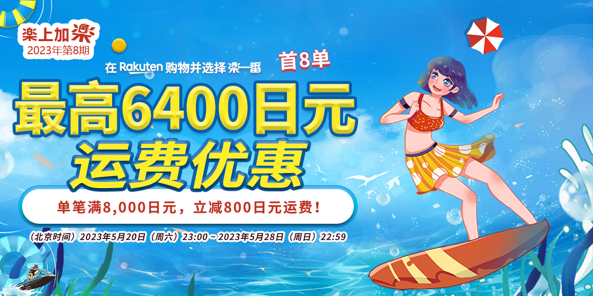 2023年5月20日(周六)23:00 ~ 2023年5月28日(周日)22:59 乐天购物单笔订单满8000减800。