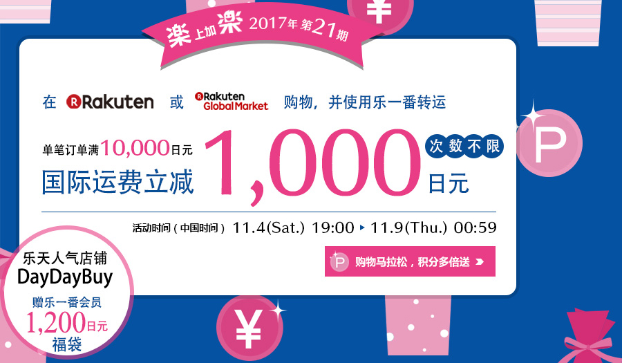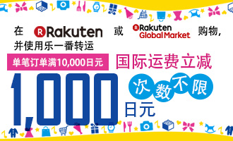 从11月4日19:00至11月9日00:59分(北京时间),在乐天购物单笔订单满10,000日元就可以立减1,000日元国际运费