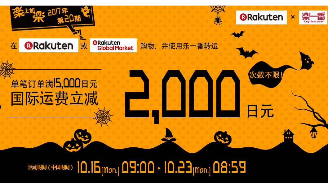 从10月16日09:00到10月23日 08:59(中国时间),乐天购物单笔满15000减2000,次数不限。