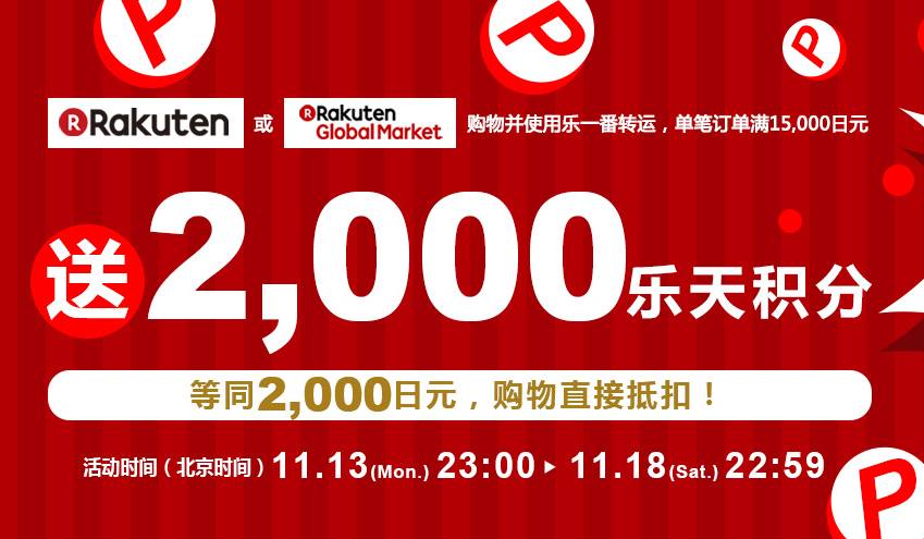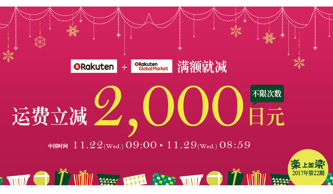 从11月22日9:00至11月29日08:59分(北京时间),在乐天购物单笔订单满15,000日元就可以立减2,000日元国际运费