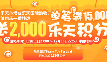 12月11日23:00 〜 12月16日22:59 乐天购物单笔满15000送2000积分,一个用户5次 (1月31日)
