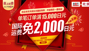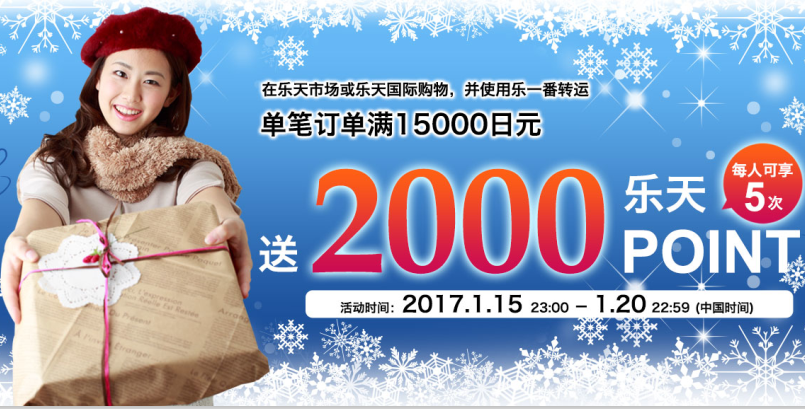 1月15日23:00 〜 1月20日22:59 乐天购物单笔满15000送2000积分,一个用户5次 (2月28日)