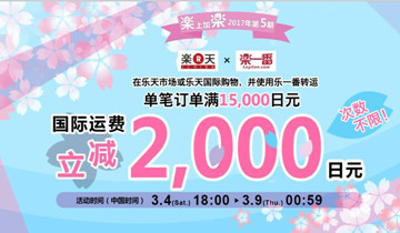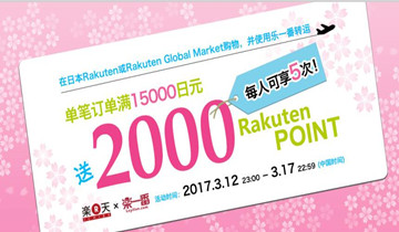 3月12日23:00 〜 3月17日22:59 乐天购物单笔满15000送2000积分,一个用户5次 (4月30日)