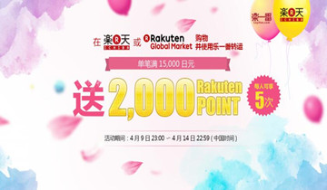 4月9日23:00 〜 4月14日22:59乐天购物单笔满15000送2000积分,一个用户5次 (5月31日)