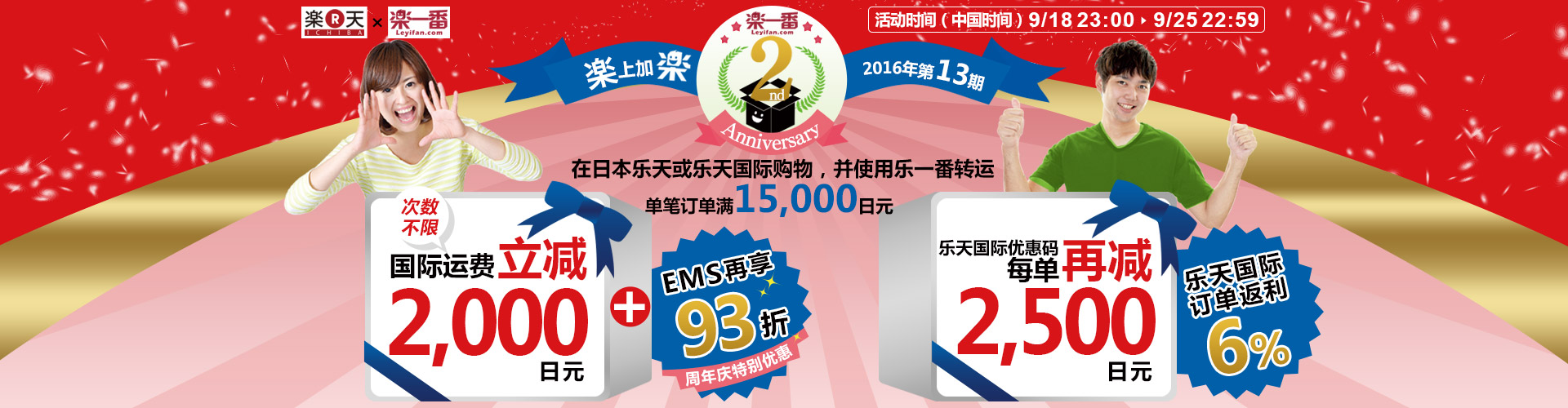 乐一番2周年折上折! 13期乐上加乐订单均可再同时享受乐一番ems 93折优惠。