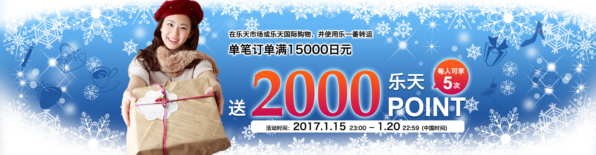 活动期间内(以乐天订单时间为准),在乐天任意一家店铺所购买的单笔订单金额满15,000日元(优惠码使用后、含税、不含运费),并使用乐一番转运发货后,可获得由日本乐天赠送的2,000点乐天积分(等值于2,000日元)。每个乐天账号可享受5次!