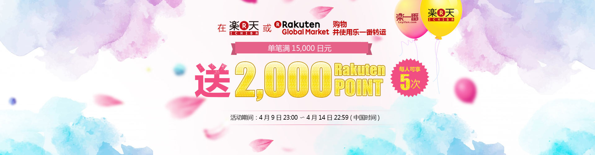活动期间内(以rakuten订单时间为准),在日本rakuten或rakuten global market任意一家店铺所购买的单笔订单金额满15,000日元(优惠码使用后、含税、不含运费),并使用乐一番转运发货后,可获得由日本rakuten赠送的2,000点rakuten积分(等值于2,000日元)。每个rakuten账号可享受5次!