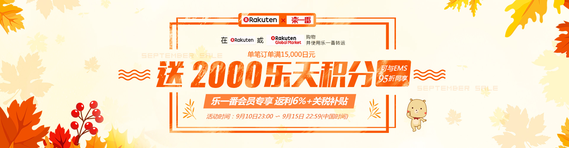 活动期间内(以乐天订单时间为准),在日本乐天或乐天国际任意一家店铺所购买的单笔订单金额满15,000日元(优惠码使用后、含税、不含运费),并使用乐一番转运发货后,可获得由日本乐天赠送的2,000点乐天积分(等值于2,000日元)。每个乐天账号可享受5次!