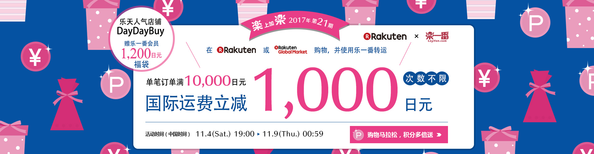 乐天购物马拉松期间内所有订单均可参与“楽上加楽”2017年第21期国际运费减免活动。