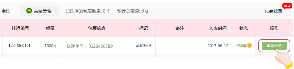 一、当您购买的商品到达乐一番仓库后,那么就可以在“包裹管理”中看到您的包裹,当包裹显示为“已称重”状态时,就可以点击“申请发货”进行发货啦!