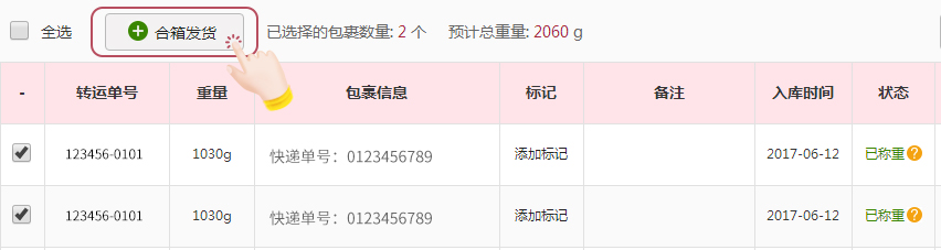 当然,如果您希望购买的多个包裹一起寄回您的手中,您也可以等其他包裹寄至仓库后,再申请“合箱发货”。