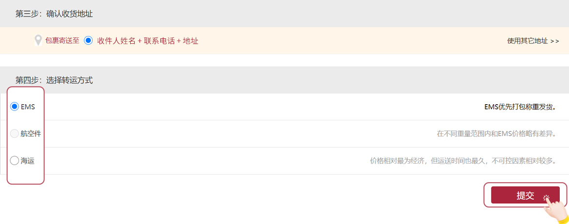 (3)确认收货地址并选择转运方式