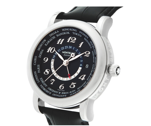 这款mont blanc 万宝龙 star world time系列 109285 男士自动机械腕表,采用4810/405自动上链机芯,21石,动力储备42小时,频率为28800次/小时,黑色表盘上柔和的六芒星辐射暗波纹从中心辐射开来,巧妙地把logo和谐的融入又富于变化,外圈显示世界常用城市时间,优雅银色阿拉伯数字时标,映衬着简洁的银色时针和六星标志秒针,亮眼的红色箭头小秒针指示着内圈的昼夜24小时轨道显示,略显复杂但条理清晰,白色六星logo表冠,也精致大气延续经典。表径42mm,厚12mm,200米防水,一般水上运动都无压力。整体设计温文尔雅,非常适合经常出差的空中飞人商旅人士佩戴。