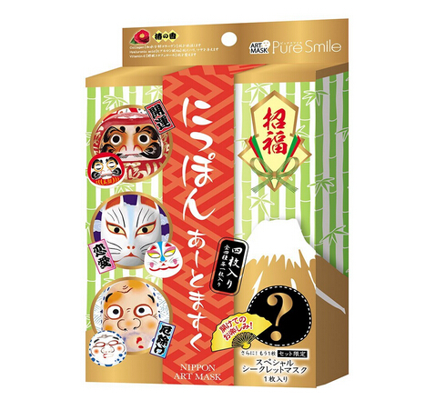 puresmile招福艺术脸谱面膜的包装非常精美,面膜精华液中所含玻尿酸量是普通面膜的2倍,胶原蛋白也是普通面膜的两倍,对于面部的补水滋润作用非常明显,每片含有27ml的美容液。puresmile招福艺术脸谱面膜的一个重要卖点就是精致的脸谱图案,一共四款不同的图案,除了一款保密的图案外其余三款的意味分别是:开运、求恋爱和除厄运的,送给朋友不光是送面膜,也是送好运。
