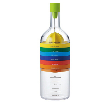 akebono 曙产业生产的厨房用品都充满让人眼前一亮的创意设计。这款厨房工具组8件套就是其中之一。色彩斑斓的漂亮外表之内,包含了漏斗、柠檬榨汁器、磨泥器、切蛋器、刨丝器、扭罐头帮手、蛋黄分离器和量杯,用的时候是功能强大的一堆工具,不用的时候只是一个安静的漂亮瓶子,美观实用的同时还非常节省空间。从原材料到最终生产皆为日本制造,安全卫生。切蛋器的耐热温度120度,耐冷温度-20度,除切蛋器以外的其他的耐热温度80度,耐冷温度-30度,可以洗碗机清洗,请勿开水烫洗。