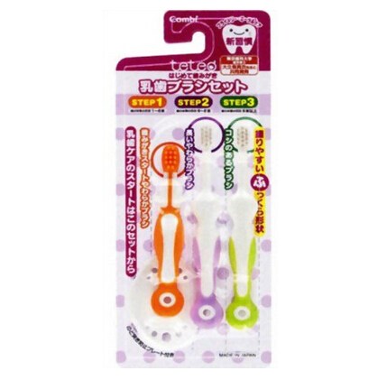 combi 康贝 teteo婴幼儿乳齿牙刷组合套装 中的三支牙刷适用于不同年龄阶段的宝宝。橙色牙刷适合于有1~6颗牙的宝宝、紫色牙刷适合于有6~8颗牙的宝宝,当宝宝有9颗牙以上是,可以使用绿色牙刷。