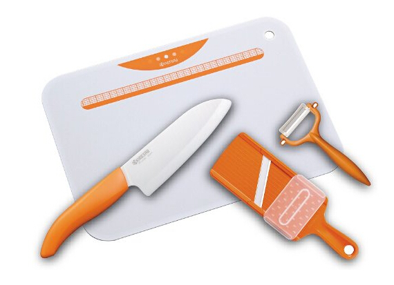 该款套装包括1把京瓷刀,1把削皮器,1个削菜刀,1块软菜板,刀刃非常锋利,能削出如纸一样薄的肉片,不生锈变色,健康环保,可耐各种强酸碱物质,清洁容易。该刀完全无磁性,且为全致密材料,无孔隙,保持食品的原色、原味,材料化学性能稳定,不与食物发生任何反应。色泽圆润、洁白,有玉的质感,平添高贵享受,性质稳定,可以使用大部分的洗涤剂,可以用漂白水漂白,可以用洗碗机清洗。