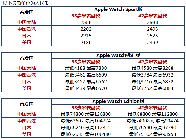 说到预售时间和预售价,其实在发布会上苹果也公布了,2015年4月10号接受预定,4月24日正式上市。首发中国内地、香港以及日本、英国、美国等国家和地区。这里梳理出了大家最为关心的中国大陆、中国香港、美国以及日本这四个国家和地区的价格明细对照。(注:所有价格均为苹果凯发k8官网手机客户端官网显示的价格,其中美国、日本apple watch的价格为税前价格。)