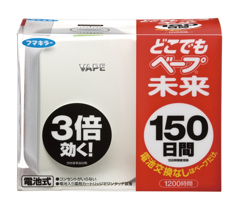 vape 未来 无毒无味电子驱蚊器 3倍效力 150日款采用药盒与电池一体化设计,不用插电,可自由移动,体积也比较小,携带方便。无毒无味,超静音,持久有效,可放心使用。日常8小时使用,可连续使用150日,安全舒适的度过蚊虫较多的夏季。使用时,按下开关,指示灯变亮即开始工作,若按下开关后指示灯不变亮即为提示更换药盒。