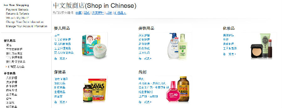 日亚的中文导航页清晰而一目了然,根据中国顾客的购买习惯作了分类,大家喜欢的尿布、药妆、健康保健品和各种美容产品分门别类。一些大家所熟知的日本品牌,比如花王,狮王,资生堂,贝亲等生活品牌也分别列出,方便大家根据品牌来检索喜欢的商品。