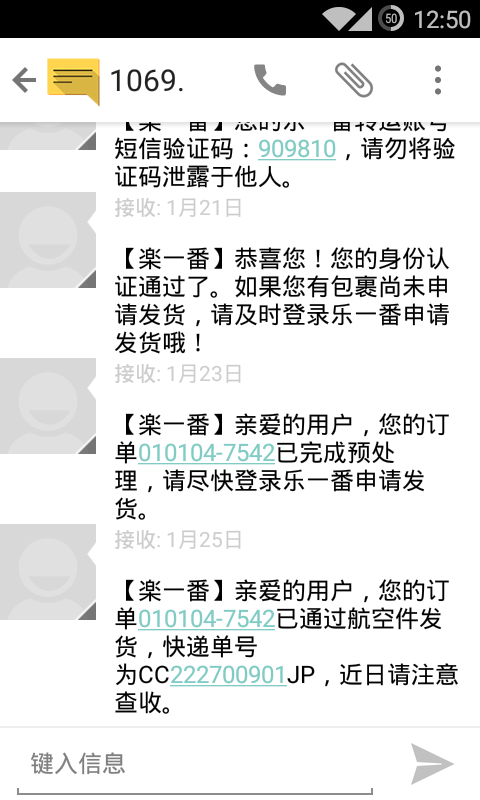 其中问了客服很多与转运有关无关的小白问题,基本都是秒回,23号入库,25号发货,短信、邮件实时推送跟踪订单,历时8天无税到手,客服赞、速度快,下次还会选择乐一番!