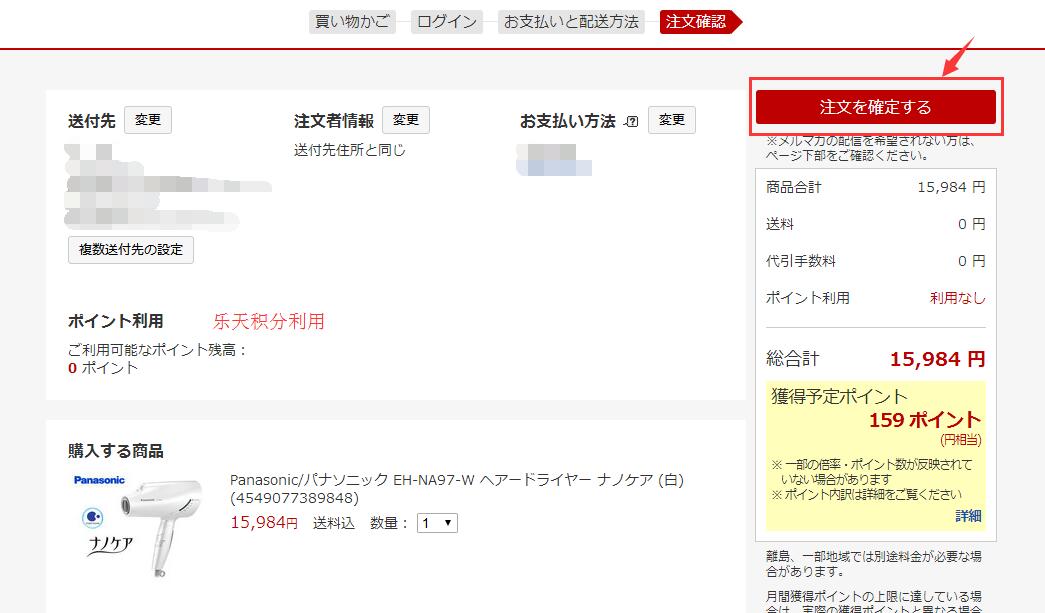 最后确认所有订单信息,如果需要使用乐天积分的记得在这一步使用哦~