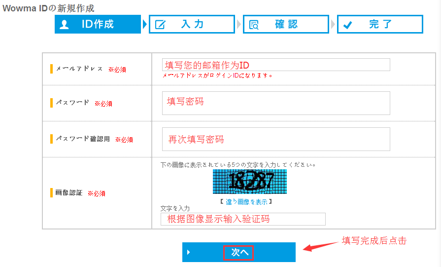 2、填写您的邮箱地址作为id账号,填写两次密码和图像验证码后,点击确认