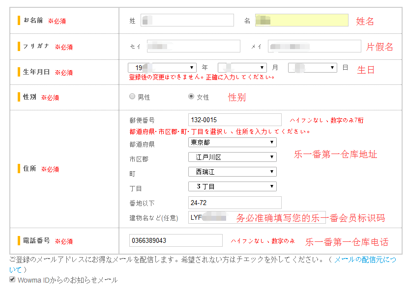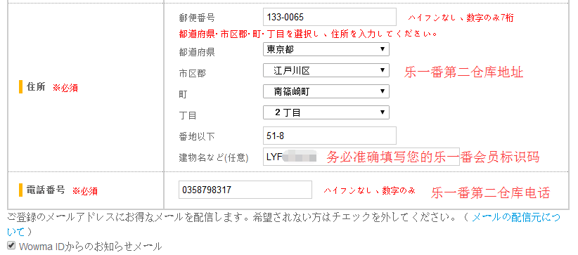 3、接下来需要填写包括地址在内的会员信息,不要忘记填入您的专属乐一番会员标识码哦!