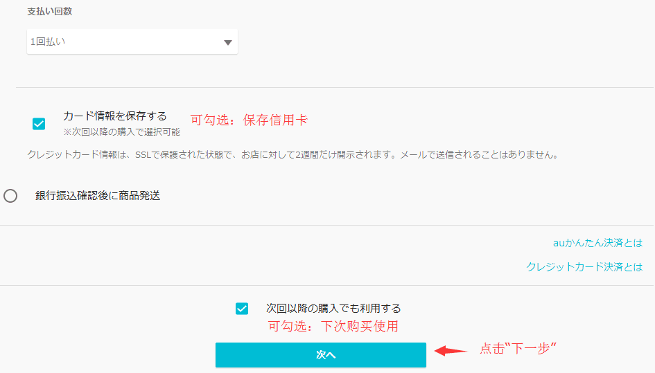 5、勾选是否保存信用卡以便下次使用后,点击“下一步”